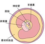 包围着胎儿的羊膜囊由两层组成,里面的那层膜称为羊膜,外面的那层被称为绒毛膜。绒毛膜提供组织以形成胎盘。3周左右的胎芽,其大小刚能用肉眼看到,长度为约5~9毫米,重量不足1克,从外表上看身体是二等分(头部非常大,约占身长的一半),头部直接连着躯体,有长长的尾巴,其形状很像小海马。这时还看不出和其他动物的胎芽有什么区别,胳膊、腿大体上有了,但因为太小看不清楚。其表面被绒毛组织(细毛样突起组织)覆盖着,这不久将形成胎盘。脑、脊髓等神经系统,血液等循环器官的原型(形成基础的组织)几乎都已出现。