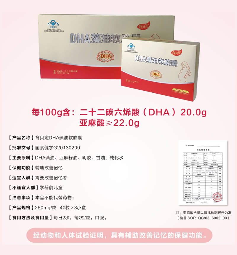 本品是以DHA藻油、亚麻籽油、明胶、甘油、纯化水为主要原料制成的保健食品,经动物和人体试食功能试验证明,具有辅助改善记忆的保健功能。